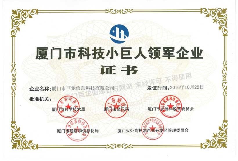 廈門市科技小巨人領(lǐng)軍企業(yè)證書