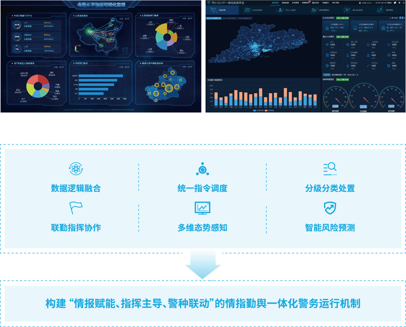 以情報指揮中心統(tǒng)籌全局的中樞指揮機構、情報研判機構、快速反應協(xié)調(diào)機構全新定位,通過強化情報信息 的先導性、引領性作用,以情報搜集研判為主線,以指揮調(diào)度機制為落腳,聚合共享多源情報信息與能力手段,配套多警種合成作戰(zhàn)機制,橫向打通各警種業(yè)務及資源共享壁壘,縱向貫穿部省市縣所五級聯(lián)動,著力打造“情指融合、情勤聯(lián)動、情輿一體”現(xiàn)代化警務運行機制,提升警務運行質(zhì)效和實戰(zhàn)能力。