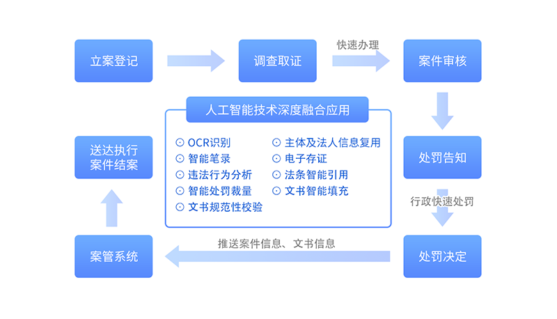 法度簡案速辦系統(tǒng)應(yīng)用“互聯(lián)網(wǎng)+辦案”的創(chuàng)新思維重塑傳統(tǒng)辦案流程,將人工智能技術(shù)深度融入案件辦理環(huán)節(jié),通過違法行為智能分析、行政處罰智能裁量、執(zhí)法法條智能引用、法律文書智能填充等方式實現(xiàn)市場監(jiān)管執(zhí)法領(lǐng)域頻發(fā)的100多類違法行為案件的高效辦理。