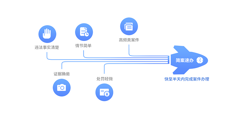 法度簡案速辦系統(tǒng)有別于簡易程序,是普通程序的簡化,包括立案、現(xiàn)場檢查取證、詢問筆錄、案件審核、告知、處罰、回執(zhí)等案件辦理流程,系統(tǒng)設(shè)計符合法律法規(guī)的相關(guān)規(guī)定和要求: