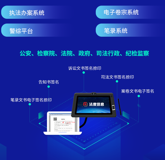 應用場景:筆錄文書電子簽名捺印、告知書簽名、訴訟文書簽名捺印、司法文書簽名捺印、案卷文書電子簽名等。