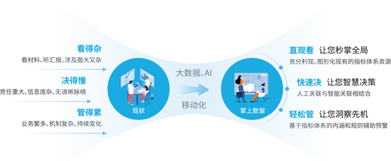 通過提供豐富多樣接入方式的數(shù)據(jù)采集能力、基于指標(biāo)體系快速構(gòu)建的數(shù)據(jù)可視化能力、在線批示一鍵閉環(huán)的業(yè)務(wù)協(xié)作能力、及時(shí)精準(zhǔn)有效的決策輔助能力以及多維度精細(xì)化的權(quán)限管控能力,構(gòu)建從采、看、批、決、控 的全鏈路看數(shù)業(yè)務(wù)解決方案,解決業(yè)務(wù)決策者看得雜、管得累、決得慢等痛點(diǎn)問題。