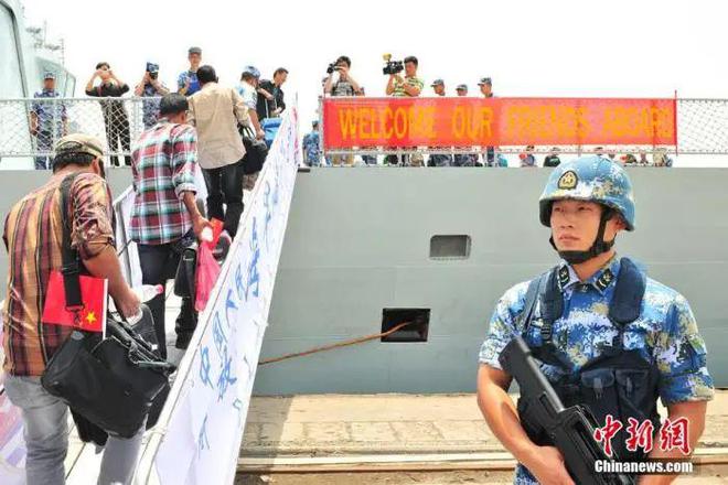 資料圖:海軍護航編隊臨沂艦抵達也門荷臺達港,撤離中外人員。中新社發(fā) 熊利兵 攝