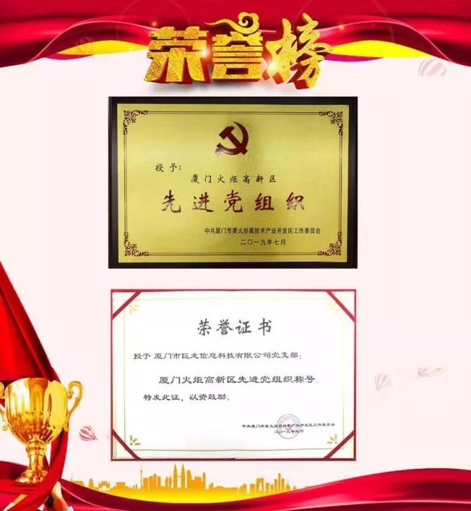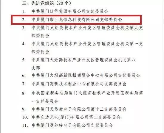 中共廈門市巨龍信息科技有限公司支部委員會榮獲“廈門火炬高新區(qū)先進(jìn)黨組織”稱號。