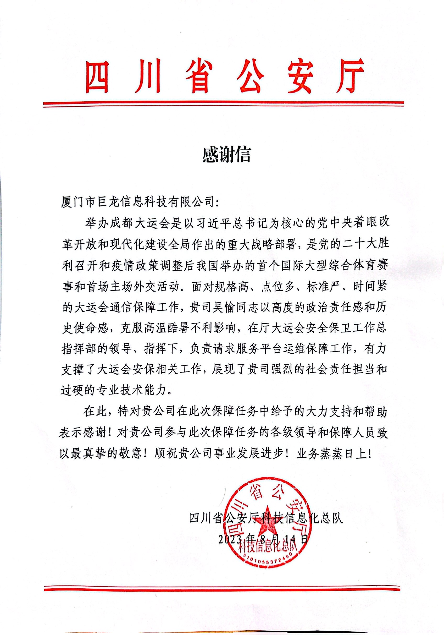 近日,第三十一屆世界大學(xué)生夏季運(yùn)動會在成都圓滿落幕,巨龍信息現(xiàn)場技術(shù)人員憑借過硬技術(shù)和優(yōu)質(zhì)服務(wù)圓滿完成系統(tǒng)保障工作,收到來自四川省公安廳科信總隊的感謝信,高度肯定現(xiàn)場技術(shù)人員專業(yè)的技術(shù)能力和盡職盡責(zé)的敬業(yè)精神。