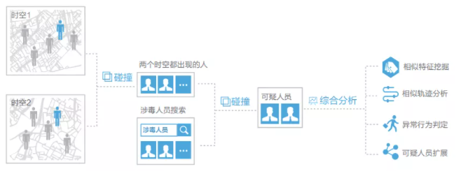 基于對(duì)象庫(kù)及關(guān)系庫(kù),將旅館住宿數(shù)據(jù)、卡口過車數(shù)據(jù)、WIFI數(shù)據(jù)、鐵路購(gòu)票數(shù)據(jù)、航空乘機(jī)數(shù)據(jù)等數(shù)據(jù)各類軌跡數(shù)據(jù)統(tǒng)一映射到人,最終形成產(chǎn)生這些軌跡數(shù)據(jù)的人群集合。