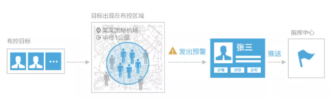 針對(duì)特定目標(biāo)(人員、車輛等)在指定區(qū)域(地圖框選、行政區(qū)劃)實(shí)施布控,當(dāng)目標(biāo)群體的軌跡出現(xiàn)在布控區(qū)域內(nèi)時(shí),觸發(fā)預(yù)警。